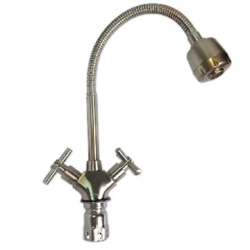 Смеситель для кухонной мойки и раковин, матовый, металлокерамика, из нержавеющей стали марки 304, массивный корпус с гибким изливом, с большим двухрежимным аэратором для экономии воды. Крепление резьба - гайка. Кранбуксы металлокерамика 1/2, ручки крест, поворот на 90?. Габаритные размеры: высота 300 - 400 мм, длина 250 - 300 мм, диаметр посадочного седла 40 мм, длина резьбы 60 мм, длина подводки 500 мм. Вес - 1,400 кг, объём - 0,00635 м3. В комплекте корпус с изливом, паспорт, подводка 1/2, крепёж.