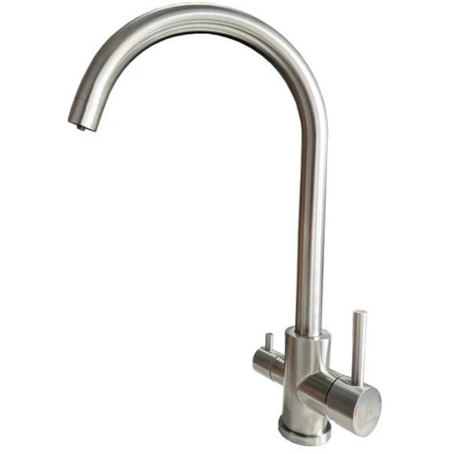 Смеситель для кухни с дополнительным выходом на питьевую воду АНТЕЙ®, серия Булат Смеситель с выходом для питьевой воды отличается более сложной конструкцией. Смеситель оснащен тремя подключениями: два — к водопроводу, один — к фильтру. Излив сконструирован по принципу двух трубок — одна в другой. По внутренней трубке идёт отфильтрованная вода, по внешней — водопроводная, за счет этого нет смешения чистой и обычной воды. Установка смесителя с дополнительным выходом на питьевую воду серии Булат позволит сэкономить время и деньги, которые ранее были потрачены на покупку питьевой воды, а также сэкономить пространство на кухне. Характеристики: - Корпус: нержавеющая сталь - Картридж: o35, с керамическими пластинами - Кран-букса: 1/2" дюйма 20 шлиц, латунная с керамическими пластинами. - Излив: высокий, поворотный - Аэратор: пластиковый, съемный, внутр. резьба O22мм - Крепление: система быстрого монтажа FAST FIX - В комплекте: гибкая подводка 1/2" дюйма, M8, 2 шт (M8,400 мм), для питьевой воды M8 1 шт (350мм)