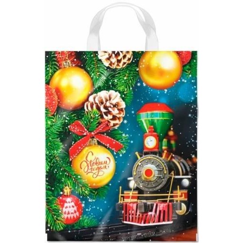 Пакет новогодний, красочный, плотный, вместительный, защищает от повреждений и сохраняет в тайне содержимое, габаритные размеры 28х35 см.