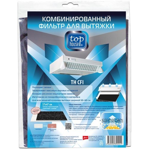TOP HOUSE Комбинированный фильтр для кухонной вытяжки TH CFI (жиропоглощающий с индикатором + угольный), 57х47 см. Система из двух фильтров, подходит к любым кухонным вытяжкам шириной 50-60 см, удаляет запахи и улавливает все жировые испарения. Изменение цвета специального индикатора сообщает о необходимости замены фильтра. Пожаробезопасен.