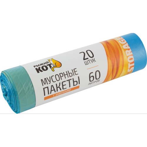 Мешки для мусора РЫЖИЙ КОТ 60л, 20шт. с завязками, ПНД синие (310399)