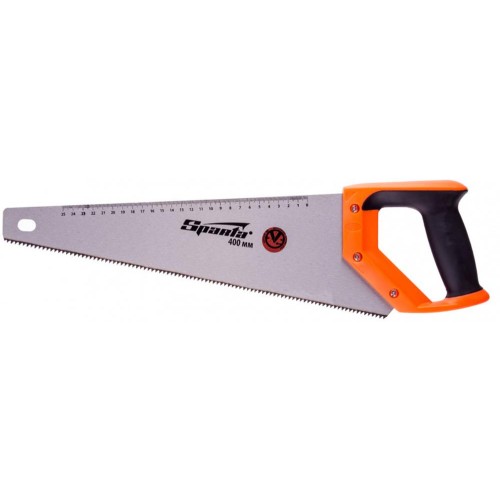 Ножовка по дереву Sparta 235015 с полотном длиной 400 мм, с калеными зубьями с 2D-заточкой и шагом 7-8 TPI, с двухкомпонентной рукояткой, используется во время столярных и плотницких работ. Зубья имеют двухгранную заточку, поэтому ножовкой можно пилить как от себя, так и на себя. Шаг зубьев составляет 7-8 TPI, что обеспечивает быстрый рез. В случае снижения производительности пилы ее рабочую кромку можно заточить.ПреимуществаПрочность и износостойкость — полотно из пружинной стали 65Mn устойчиво к динамическим нагрузкам, каленые зубья твердостью 55 HRC долго сохраняют режущую способность.Долговечность — полотно покрыто лаком для защиты от коррозии.Надежность — полотно, закрепленное 3 винтами, не выпадет во время пиления.Комфортная работа — двухкомпонентная эргономичная рукоятка надежно лежит в руке.