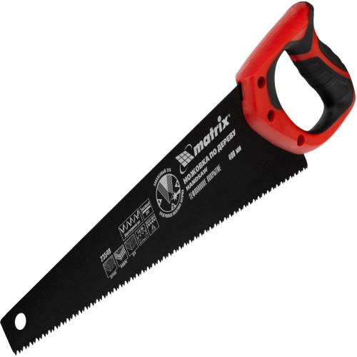 Ножовка по дереву Matrix 23549 с полотном длиной 400 мм, калеными зубьями с шагом 7-8 TPI и 3D-заточкой, с тефлоновым покрытием полотна и 2-компонентной рукояткой, пилит древесину, фанеру и ДСП. Подходит для продольного и поперечного пиления, используется для быстрой распиловки заготовок. Трехгранная заточка зубьев обеспечивает повышенную производительность. Ножовка будет полезна столяру, плотнику, пригодится также в домашнем хозяйстве.ПреимуществаПрочность — полотно из холоднокатаной стали 65Mn выдерживает динамические нагрузки.Высокий ресурс — закаленные зубья твердостью 50-55 HRC долго держат заточку, полотно с тефлоновым покрытием не боится коррозии.Повышенная скорость распиловки — тефлоновое покрытие улучшает антифрикционные свойства полотна.Эргономичность — двухкомпонентная рукоятка удобно лежит в руке, уменьшая усталость во время длительной работы.Надежная конструкция — рукоятка крепится к полотну при помощи 3-х винтов.Гарантированное качество — инструмент изготовлен на заводе с японским оборудованием и прошел строгий контроль на каждом этапе производства.