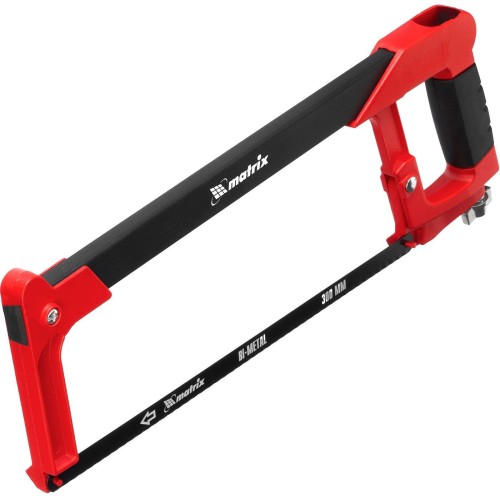 Ножовка Matrix 77593 с биметаллическим полотном длиной 300 мм и обрезиненной рукояткой — многоцелевой инструмент для резки металла, древесины и пластика. Поворотные крепления позволяют устанавливать полотно под углом 45 и 90 градусов для продольного распила заготовок. Ножовка используется для проведения слесарных и строительных работ. Преимущества Высокая скорость работы — биметаллическое полотно изготовлено из пружинной и быстрорежущей стали. Прочность и долговечность — металлическая рама выдерживает длительное использование. Эффективная работа с различными заготовками — степень натяжения полотна можно регулировать при помощи винтового механизма. Эргономичность — в раме предусмотрен специальный отсек для хранения и безопасной транспортировки запасных полотен. Комфортная работа — рукоятка с прорезиненной вставкой не скользит в руке.