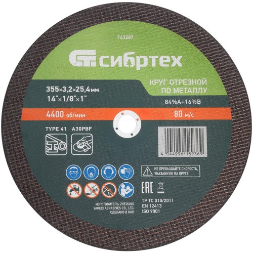 СИБРТЕХ Круг отрезной по металлу, 355 х 3,2 х 25,4 мм, 84%A+16%B// 743287