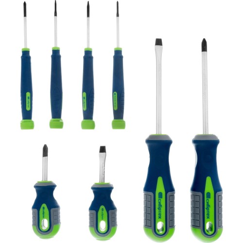 Универсальный набор отверток Сибртех 13375 включает 8 предметов из стали CrV с трехкомпонентными рукоятками, рассчитанных на бытовое использование. Отвертки предназначены для монтажа/демонтажа стандартных крепежных элементов и микровинтов с профилем SL и PH. Длина стержней 38-100 мм позволяет работать в узких пространствах и небольших углублениях.ПреимуществаСтержни из стали CrV имеют хромовое покрытие, а наконечники — фосфатное, поэтому инструменты обладают устойчивостью к коррозии и деформации.Рабочие части отверток прошли дополнительную закалку до твердости 50-52 HRC, что повышает сопротивляемость нагрузкам.Рукоятки прорезинены и имеют насечки, благодаря чему не проскальзывают в руке.Подвесная пластиковая карта позволяет удобно разместить набор на рабочем месте.