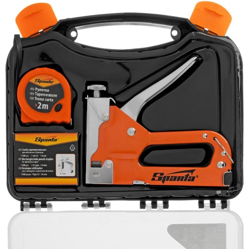 Набор Sparta 42003 состоит из мебельного регулируемого степлера, совместимого с крепежом типа 53 размером 4-14 мм, 500 скоб и рулетки с длиной ленты 2 м. Инструменты позволяют измерять и закреплять на деревянном основании оргалит, фанеру, ДСП, ДВП, пленку, утеплитель и другие листовые материалы. Набор будет полезен для сборки и перетяжки мебели, укладки напольных покрытий и монтажа теплоизоляционного материала. Подходит для бытового применения.ПреимуществаПрочность и долговечность — корпус степлера изготовлен из стали методом штамповки и окрашен для предотвращения образования коррозии.Эффективная работа с материалами разной плотности — винтовой регулятор позволяет плавно изменять силу удара.Безопасное хранение и транспортировка — металлическая скоба-фиксатор удерживает рукоятку степлера в нерабочем положении, предотвращая самопроизвольное срабатывание ударного механизма.Готовность к использованию — в комплект поставки входит упаковка из 500 скоб размером 8 мм, крепеж не нужно приобретать отдельно.Удобная упаковка — набор упакован в прочный пластиковый кейс.