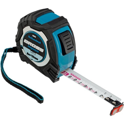 Рулетка Gross «Magnetisch» 32573 в обрезиненном корпусе, с полотном размером 8 м х 25 мм, магнитным зацепом, нейлоновым покрытием и функцией автоматической фиксации, используется во время ремонтных и строительных работ. Оптимальна для измерения стен, полов, различных заготовок, мебели, оконных проемов и т.д. Благодаря магнитному зацепу рулетку удобно использовать для работы с металлическими поверхностями, а широкое упругое полотно облегчает проведение замеров в труднодоступных местах.ПреимуществаНадежность — обрезиненный корпус устойчив к повреждениям, выдерживает случайные падения с небольшой высоты.Износостойкость — нейлоновое покрытие защищает измерительное полотно от истирания.Функциональность — лента автоматически фиксируется в вытянутом положении и возвращается в корпус только после нажатия кнопки.Точная работа — подвижный зацеп позволяет не учитывать его толщину при выполнении измерений с нуля.
