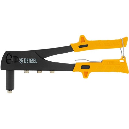 Ручной заклепочник Denzel 40440 длиной 255 мм предназначен для работы с алюминиевыми вытяжными заклепками диаметром 2,4-3,2-4,0-4,8 мм, стальными диаметром 2,4-3,2-4,0 мм и вытяжными заклепками из «нержавейки» диаметром 2,4-3,2 мм. Инструмент позволяет соединять листовые металлические заготовки, металлопрофиль и легкие конструкции небольшой толщины. Используется для проведения строительных, ремонтных и монтажных работ как в быту, так и в профессиональной сфере.ПреимуществаДолговечность и устойчивость к нагрузкам — корпус выполнен из стали и покрыт защитной краской, а цанговый зажим — из хромомолибденовой стали 35Х.Комфортная работа без ощущения усталости — благодаря эргономичным рукояткам и небольшому весу инструмента 570 г нагрузка на руки снижена.Полная готовность к эксплуатации — в комплект поставки входят сменные головки для заклепок разного размера, а также ключ для замены насадок.Высокое качество — заклепочник произведен на современном оборудовании под строгим технологическим контролем.