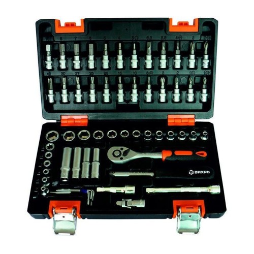 Набор инструментов ВИХРЬ, 1/4", 57 предм, кейс. Ключ трещоточный 1/4"" CrV, PP+TPR. Кардан 1/4"" CrV. Удлинитель CrV 1/4"" 50 мм, 100 мм. Отвертка-держатель 1/4"" CrV. Комплект шестигранных ключей 1.5мм, 2.0мм, 2.5мм, 3.0мм, 4.0мм Головки торцевые CrV 1/4"" 4, 4.5, 5, 5.5, 6, 7, 8, 9, 10, 11, 12, 13, 14 +удлинённые 6, 7, 8, 10. Головки торцевые S2 1/4"" со вставкой Т8, T10, Т15, Т20, Т25, Т27, Т30, Т40 H3, H4, H5, H6, H7, H8, H10 SL4, SL5.5, SL6,5 PH1, PH2, PH3 PZ1, PZ2, PZ3. Головки торцевые CrV 1/4"" E4; E5; E6; E7; E8; E10.