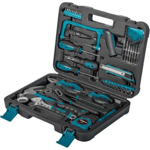Головки 1/4" (9 шт) Нож (1 шт) Отвертка часовая (6 шт) Отвертка (2 шт) Держатель для бит 170 мм с трещеткой (1 шт) Ножовка по металлу (1 шт) Отвертка-тестер (1 шт) Биты (10 шт) Плоскогубцы (1 шт) Длинногубцы 160мм (1 шт) Ключ разводной (1 шт) Клещи переставные (1 шт) Рулетка измерительная 3м (1 шт) Молоток (1 шт) Фонарик (1 шт) Изолента (1 шт) Кейс (1 шт)