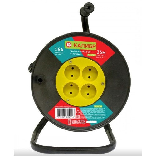 Удлинитель электрический "Калибр УСК1-25" на катушке предназначен для работы в сетях переменного тока напряжением 230±10%, ~50 Гц. При помощи удлинителя легко подключить удаленные от стационарной розетки электроприборы, имеющие шнур с плоской или круглой вилкой. Незаменим на стройке, на садовом участке, в промышленности и в быту. *в зависимости от поставки, внешний вид катушки может отличаться от представленного на фотографии. Сечение 1,5 мм2. Максимальная нагрузка 10 А, 2300 Вт. Длина кабеля 25 м.