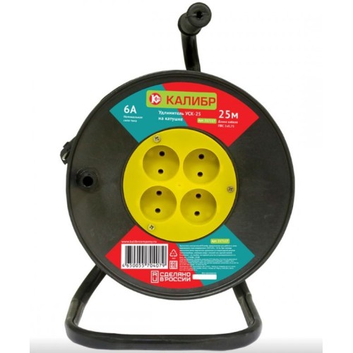 Удлинитель электрический "Калибр УСК-25" на катушке предназначен для работы в сетях переменного тока напряжением 230±10%, ~50 Гц. При помощи удлинителя легко подключить удаленные от стационарной розетки электроприборы, имеющие шнур с плоской или круглой вилкой. Незаменим на стройке, на садовом участке, в промышленности и в быту. *в зависимости от поставки, внешний вид катушки может отличаться от представленного на фотографии. Сечение 0,75 мм2. Максимальная нагрузка 6 А, 1300 Вт. Длина кабеля 25 м.