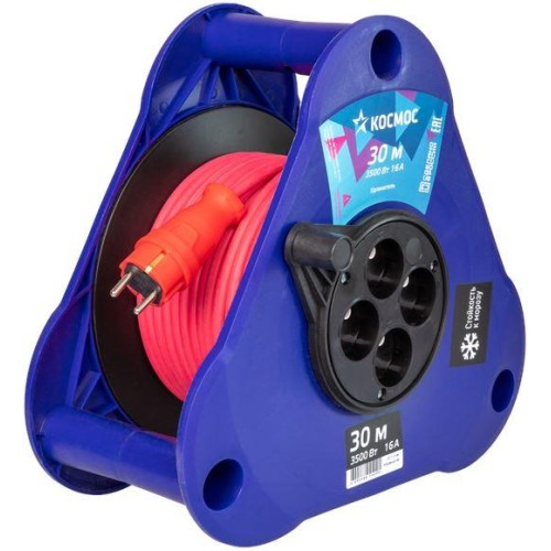 Удлинитель на катушке 30 метров на 4 гнезда. Новая катушка треугольной формы. Катушка выполнена из толстого и прочного пластика, благодаря чему, удлинитель обладает выдающимися характеристиками, а новая треугольная форма увеличивает практичность и функциональность. Кабель КГ-ХЛ морозостойкий 2х2,5мм (без заземления). Максимальная мощность подключения 3500 Вт (16А) благодаря сечению провода 2,5 мм. Удлинители 16А подойдут для мощного прибора или инструмента, либо для одновременной работы нескольких инструментов средней мощности, а провод КГ позволит использовать удлингитель даже в самый сильный мороз. Произведено в России.