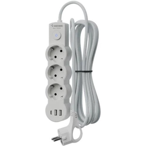 Бытовой удлинитель на 3 гнезда с кнопкой и отдельным блоком USB*2, USB typeC*1 для питания и зарядки устройств. Длина шнура 5м. Цвет белый. Большая кнопка со световой индикацией - удобно нажимать ногой. Корпус из прочного, износостойкого, негорючего пластика. Диаметр сечения провода - 3*1,00мм?. Тип провода - ПВС, номинальный ток 10А, максимальная мощность - 2800Вт. Надёжная оплётка провода с маркировкой. Заземление. Контактная группа из латуни не деформируется на протяжении всего срока службы. Сетевой удлинитель с заземлением обеспечивает повышенную безопасность использования, минимизируя риск электрических неполадок. Крепления на стену. Гарантия 5 лет.