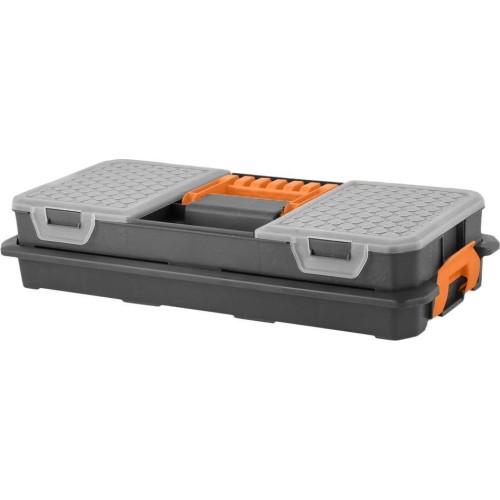 Органайзер для мелочей c лотком помогает содержать в порядке, переносить на место выполнения работ и быстро находить инструменты, метизы и аксессуары. Идеален для использования дома, на даче, в гараже, мастерской, в автомобиле. Для удобства переноски органайзер и лоток скрепляются вместе с помощью защёлок. Оснащены складными ручками. Внутреннее деление на отсеки делает удобным размещение внутри органайзера и лотка деталей, которые необходимо отделить друг от друга. Подходит для хранения рыболовных и швейных принадлежностей, коллекционирования, занятия хобби.