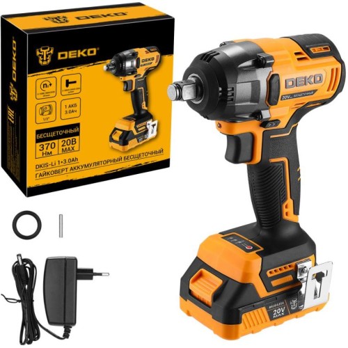 Гайковерт аккумуляторный бесщеточный ;DEKO ;DKIS-Li 1*3.0Ah ;предназначен для закручивания/ослабления болтов и гаек, сборки деревянных конструкций, сантехнических и общестроительных работ. Этот гайковёрт имеет 3 режима/скорости для затягивания болтов и 2 режима для ослабления болтов. Каждый режим означает разные скорости и мощности. Пользователь выбирает подходящий режим исходя из конкретных задач. Благодаря большому крутящему моменту можно выполнять тяжелые работы.Технические характеристики:Напряжение: 20 ВТип патрона: квадрат 1/2"Частота вращения: 0-1000/1800/2450 об/минЧастота ударов: 0-1800/0-2400/0-3200 уд/минМаксимальный крутящий момент: 370 НмЕмкость аккумулятора: 3000 мАчКомплектация:Гайковерт - 1 штАккумулятор - 1 штЗарядное устройство - 1 штСкоба поясная - 1 штСаморез - 1 штУплотнительное кольцо - 1 штШтифт - 1 штРуководство по эксплуатации - 1 шт