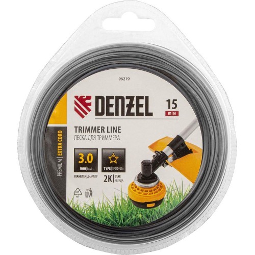 Двухкомпонентная леска для триммера Denzel EXTRA CORD 96219 с сечением «звезда», диаметром 3,0 мм и длиной 15 м, в блистере, предназначена для скашивания крупностеблевой растительности. Позволяет эффективно справляться с работой даже на замусоренной территории. Используется на бензиновых триммерах с объемом двигателя 2552 см3 и электрических триммерах мощностью от 1 до 1,5 кВт.ПреимуществаПрочность — леска изготовлена из полиамида РА6 с добавлением полиамида BASF.Повышенная стойкость к нагрузкам — благодаря прочному нейлоновому сердечнику в эластичной оболочке значительно снижен риск повреждения и обламывания лески при соприкосновении с твердыми предметами, такими как камни.Высокая скорость работы — благодаря сечению «звезда» трава срезается быстро и ровно.Экономичность — корда длиной 15 м хватит на длительный срок.