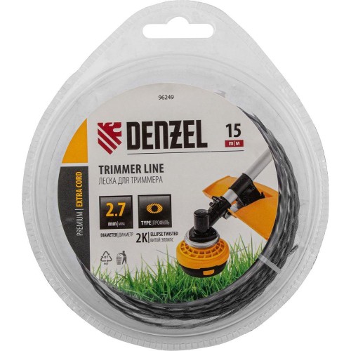 Двухкомпонентная леска для триммера Denzel EXTRA CORD 96249 с сечением эллипс, диаметром 2,7 мм и длиной 15 м, в блистере, предназначена для скашивания зарослей молодой травы. Также эффективно справляется с борщевиком и лопухами. Используется на бензотриммерах с объемом двигателя 2552 см3 и электротриммерах мощностью от 1 до 1,5 кВт. Леска подходит для профессионального использования.ПреимуществаПрочность леска изготовлена из полиамида РА6 с добавлением полиамида BASF.Высокий ресурс благодаря прочному нейлоновому сердечнику в эластичной оболочке значительно снижен риск повреждения и обламывания лески.Эффективная работа корд с сечением эллипс быстро срезает траву.Экономичность лески длиной 15 м хватит на длительный срок.