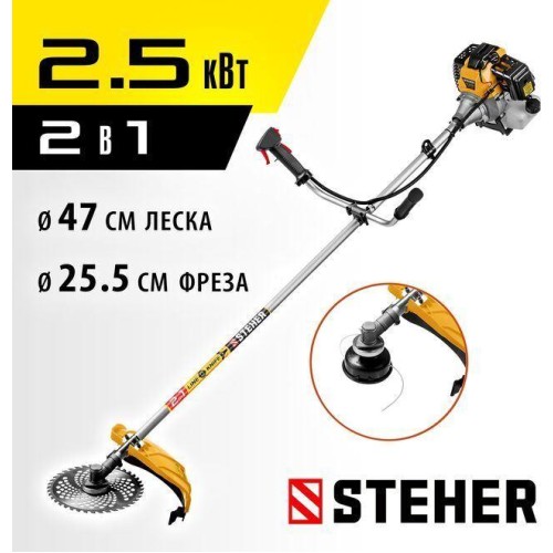 Габариты, см: 103x29x31 Мощность, л.с.: 3.3 Плечевой ремень: есть Приводной вал: жесткий Тип двигателя: бензиновый Тип ручки: u-образная (велосипедная) Частота вращения шпинделя, об/мин: 9000 Ширина скашивания для ножа, мм: 255 Мощность, кВт: 2.5 Режущий элемент: леска/диск Вес, кг: 7.3 Объем двигателя, см3: 52 Емкость бака, л: 1.2 Толщина лески, мм: 2 Ширина скашивания для лески, мм: 470 КОМПЛЕКТАЦИЯ: Коса бензиновая - 1 шт. Велосипедная рукоятка - 1 шт. Кожух защитный - 1 шт. Нож - 1 шт. Катушка с леской - 1 шт. Ключ (свечной, гаечный, имбусовый) - 3 шт. Фиксатор вала - 1 шт. Плечевой ремень - 1 шт. Емкость для смешивания - 1 шт. Руководство по эксплуатации - 1 экз.
