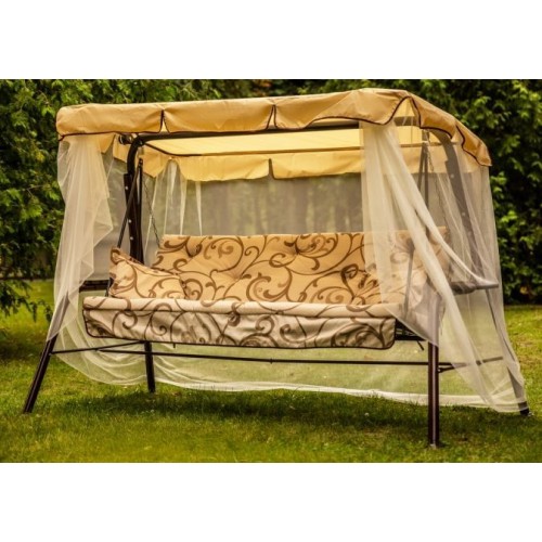Габаритные размеры сиденья,спинки и тента (длина х ширина), мм: размеры сиденья: 1706х497 размеры спинки: 1706х497 размер тканевого тента: 1840х1020 Максимальная нагрузка, кг: 210 Каркас: труба стальная O45х1,4мм; полимерное покрытие; полка - 2 шт. Мягкий элемент: ткань 45% п/э – 55% хлопок, плотность 108-111г/м2, наполнитель мягкого элемента (листовой поролон 50мм+синтепон), наполнитель подушек (крошка поролона).Основание спанбел, декор тафтинг. Подушки – 2шт. Тент с сеткой противомоскитной: ткань с водоотталкивающей отделкой 100% п/э плотность 80г/м2. Противомоскитная сетка пришита к тенту. Регулировка спинки: осуществляется звеньями цепи на требуемый угол наклона.