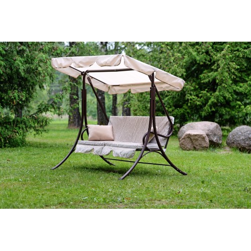Габаритные размеры изделия (длина х ширина х высота), мм: 1710х1220х1525; размеры сиденья: 1290х427, размеры спинки: 1290х498, размеры тента: 1740х1135. Максимальная нагрузка, кг: 180. Каркас: труба стальная O38х1,2 мм; полимерное покрытие. Мягкий элемент: ткань 45% п/э – 55% хлопок, плотность 108-111г/м2, наполнитель мягкого элемента "аэрофом" 50мм, наполнитель подушек – синтепон. Подушки – 2шт. Основание сиденья - ткань полипропиленовая. Тент: ткань с водоотталкивающей отделкой 100% п/э плотность 80г/м2.