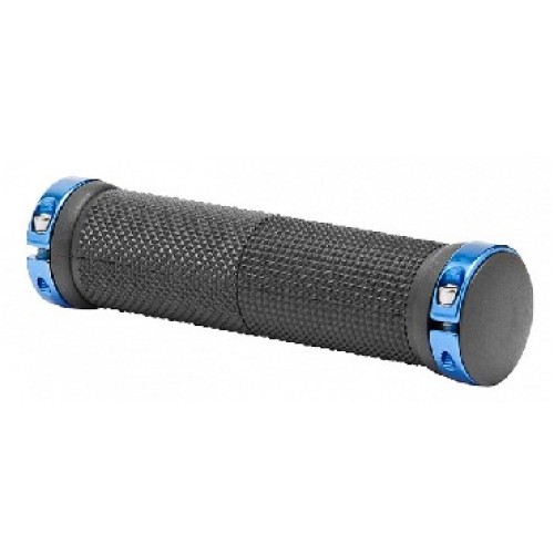 Грипсы XH-G59BL, длина 130 мм, двухсторонняя фиксация при помощи винтов, чёрная термопластичная резина с синими алюминиевыми кольцами